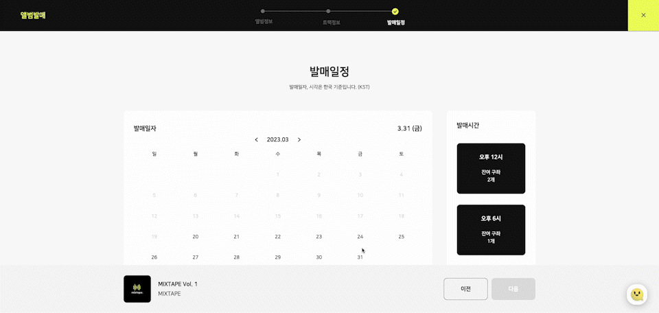 원하는 발매 날짜와 시간을 선택하고, 최종 발매 자료를 제출해 주세요.