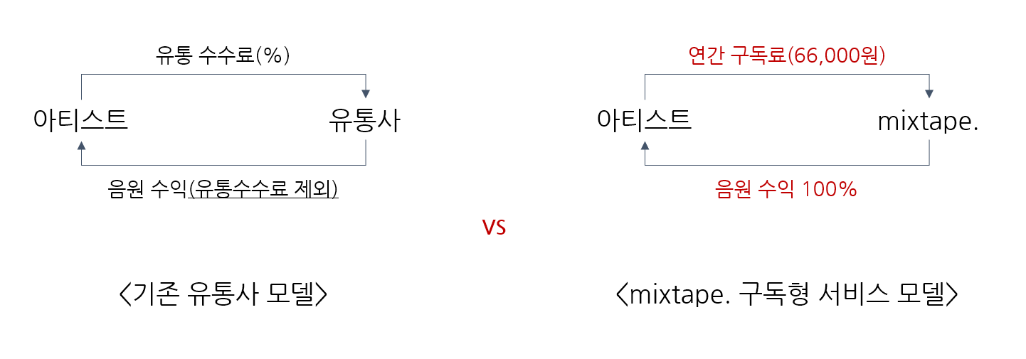 오늘은 기존 유통사 서비스 모델과의 비교를 통해, mixtape. 서비스를 보다 효과적으로 소개해 드리려고 해요.